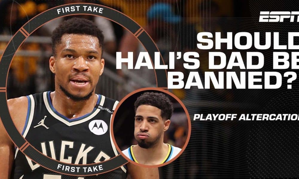 On First Take, Stephen A. Smith, Brian Windhorst and Chris “Mad Dog” Russo react to John Haliburton’s altercation with Giannis Antetokounmpo on the court following the...